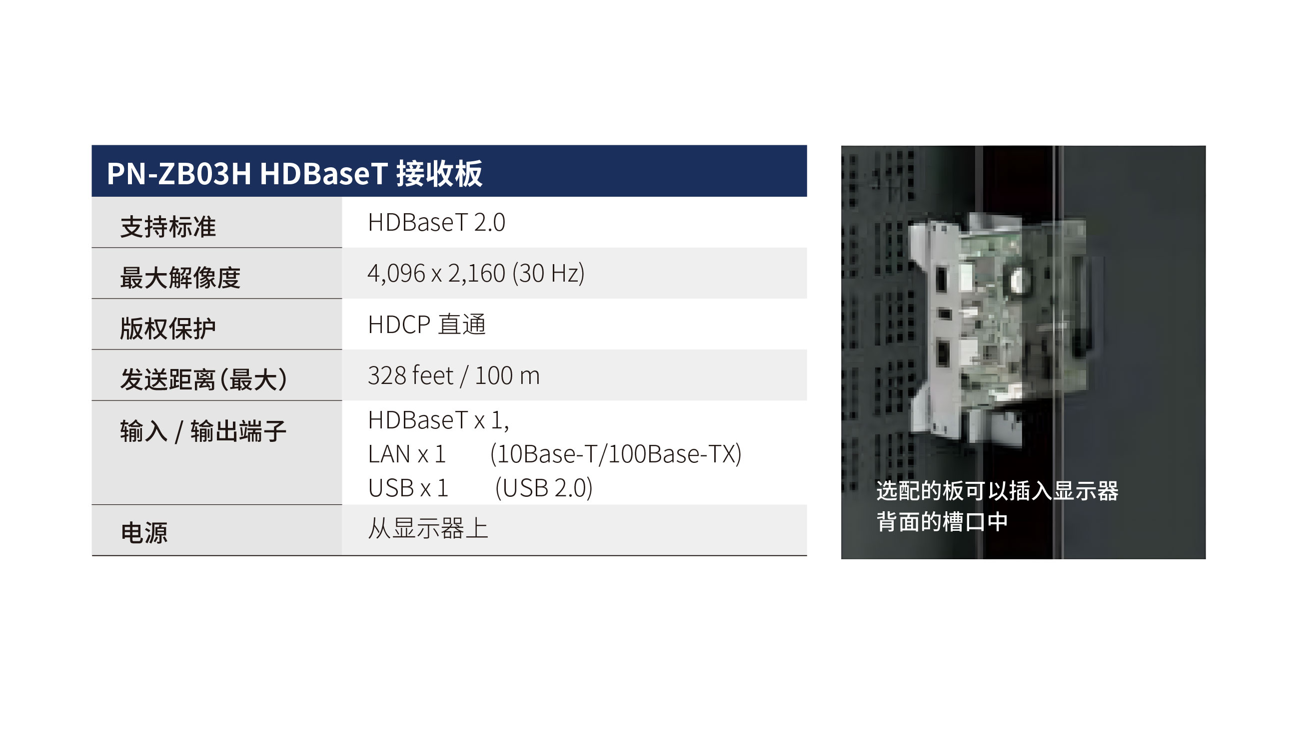 N-V701擁有一個擴充槽,用于安裝一個選配的HDBaseT接收板(PN-ZB03H)。顯示器可以通過一根局域網線纜。※1,接收100米內的HDMI視頻、音頻信號和控制信號。這為諸如電腦和藍光播放器等 HDMI設備提供便利的連接。與 HDBaseT2.0標準兼容讓您可以從一個與選配板*2相連的U盤上對電腦進行遠程操作。通過支持HDBaseT2.0,您可以使用盡量少的線纜,減少安裝時間和安裝成本。※1 CAT-6 線纜或者保護度更高的線纜需另行購買。※2 需要一個HDBaseT2.0兼容的傳送器,需另行購買。并非支持所有U盤。